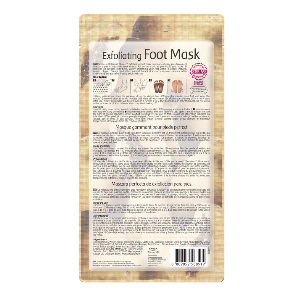 Vegan exfoliating socks for feet – PUREDERM BOTANICAL CHOICE is an exfoliating foot mask. The exfoliating and regenerating formula is designed for foot care in the form of specialized and user-friendly disposable socks soaked with effective essence. The Korean exfoliating foot mask removes all calluses in a short time and visibly smoothes the feet within 2 weeks. Papaya, lemon, apple, orange, and other natural plant extracts, combined with effective acid therapy, remove calluses and rough skin, while chamomile extract soothes the freshly exfoliated and renewed skin.