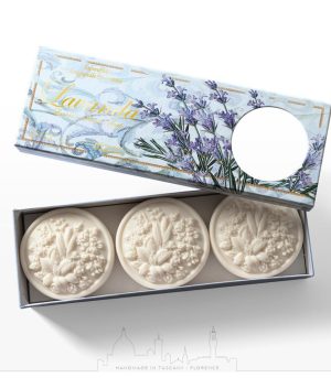 Приятный аромат вызывает пьянящие эмоции весенних лавандовых полей: свежее ощущение благополучия и легкости. Высококачественное мыло в особенно привлекательной упаковке. Упаковка, созданная по рисункам флорентийских художников ручной работы, обогащает этот набор мыла и делает его идеальным подарком.